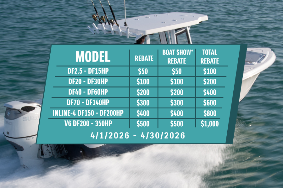 Now through April 30, 2026, Suzuki Marine is offering DOUBLE REBATES on any qualifying 2.5hp-350hp engines up to $1000, available at any approved boat show or open house. There is no better time to purchase the ULTIMATE outboard for your new boat package or to repower your current boat. Contact your authorized Suzuki Marine dealer for additional information.